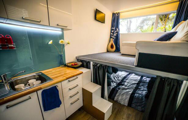 Different from other tiny house designs, the living room of the container house is actually placed above the